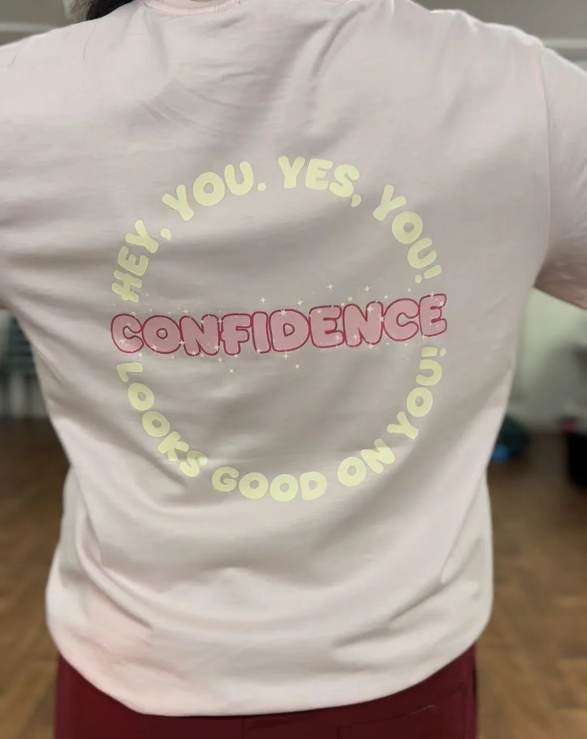 Back: A confidence-boosting message: “Hey, you. Yes, you! CONFIDENCE looks good on you!”